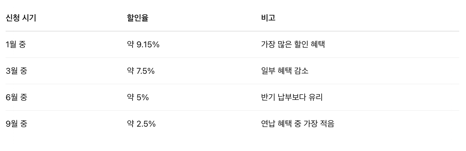 1월 연납 신청 시 최대 9.15% 할인 혜택을 받을 수 있습니다.